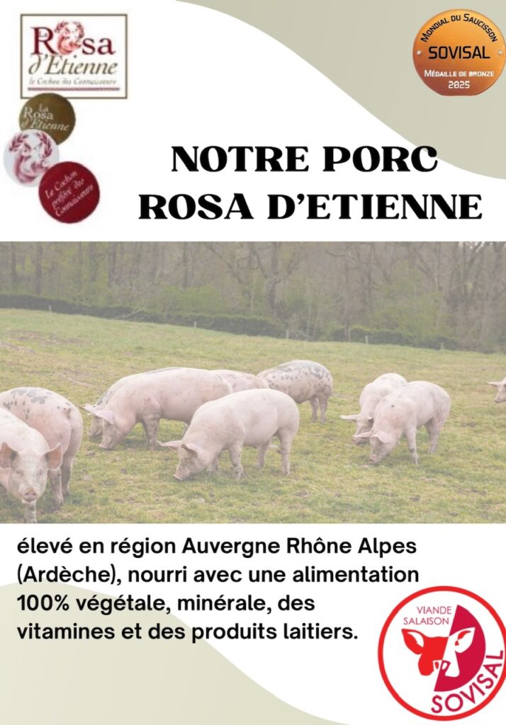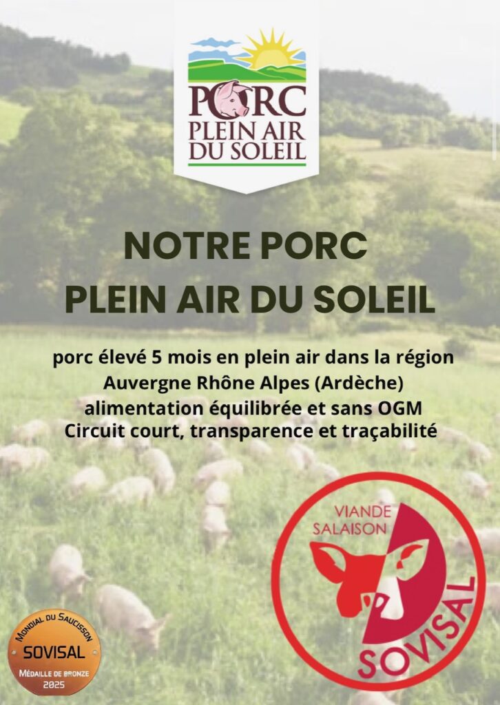 Nous nous fournissons en viande auprès de notre société, Située en Ardèche, la SOVISAL (Société de Viandes et de Salaisons), qui choisit des bêtes issues d’élevages locaux ou de marchés régionaux et prépare toutes ses viandes et ses charcuteries dans ses ateliers à St Privat en respectant les savoirs faire traditionnels.